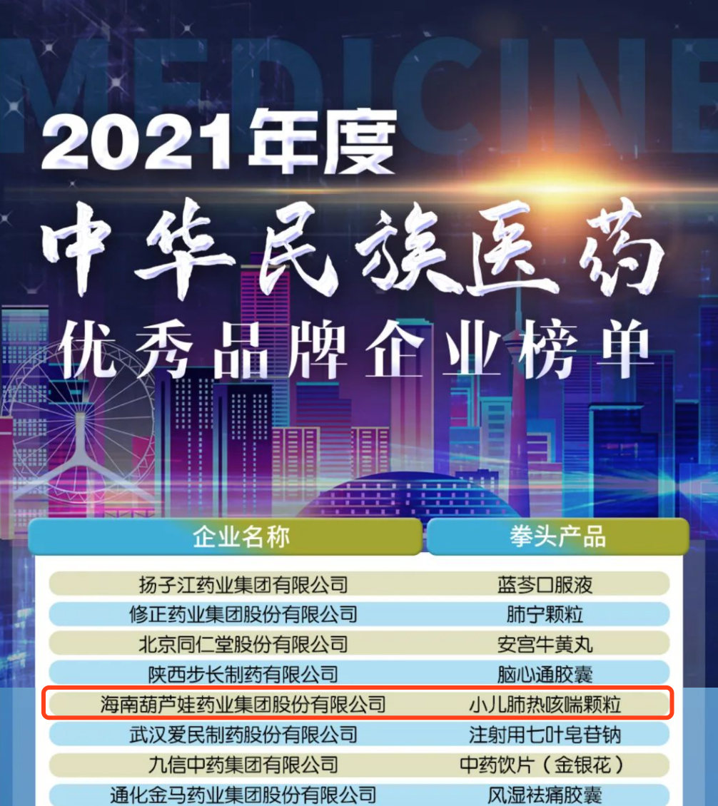 12月29日,全国工商联医药业商会发布了“2021年度中华民族医药优秀品牌企业榜单”,ag博天堂药业集团凭借黄金单品小儿肺热咳喘颗粒(4克)实力登榜。